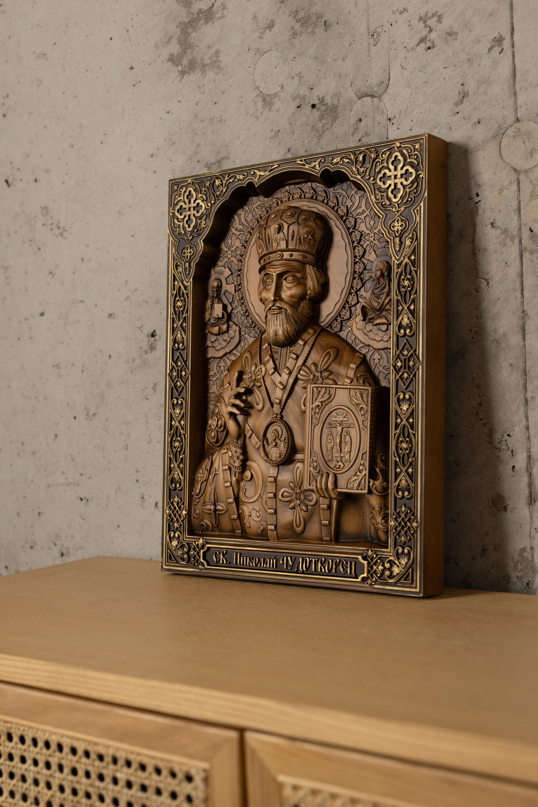 Handcrafted Oak Icon – Saint Nicholas the Wonderworker