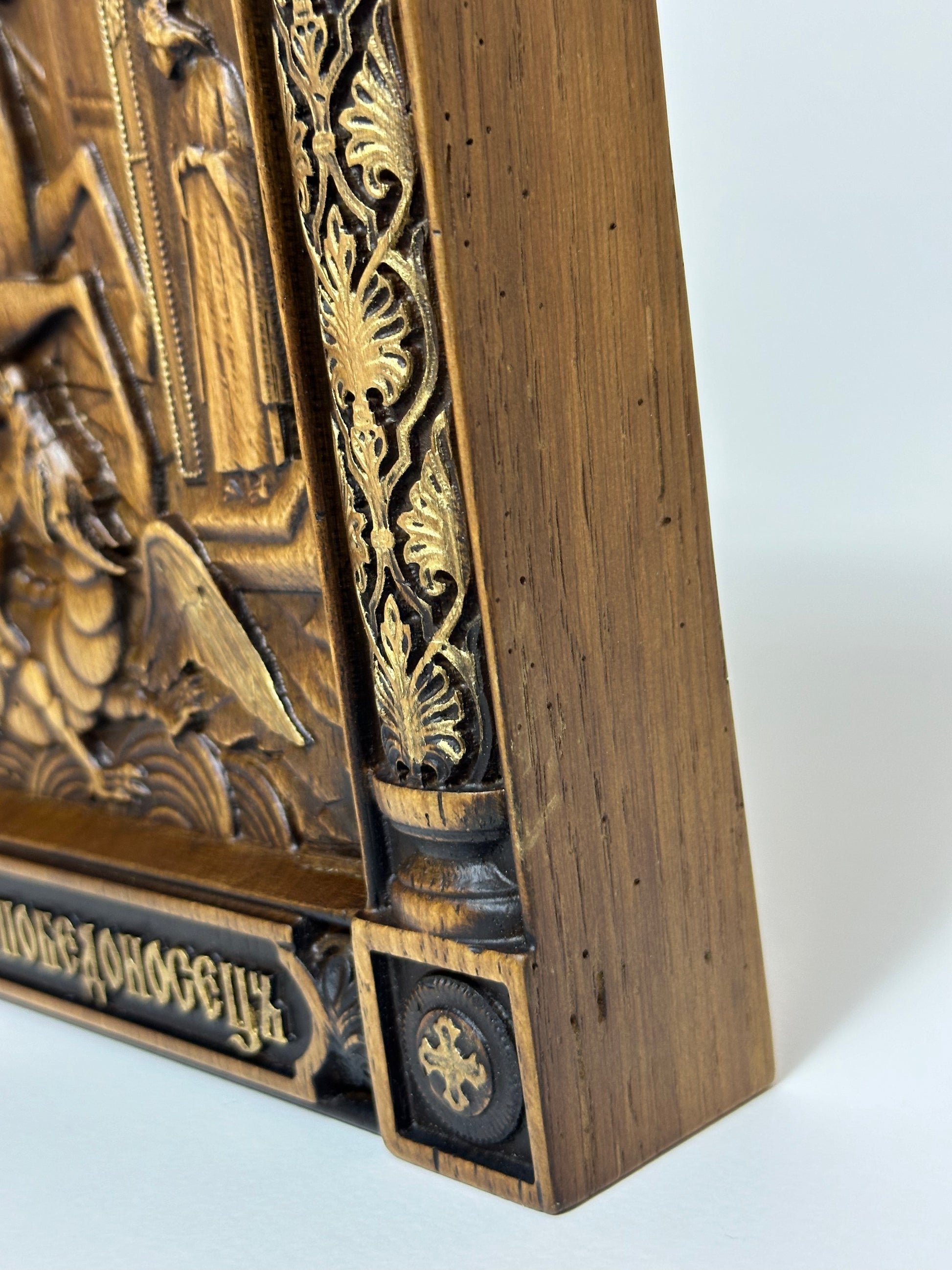 The natural wood finish combined with the detailed gold accents adds an elegant and classic touch, making it a perfect gift for religious occasions or a meaningful addition to your own icon collection.