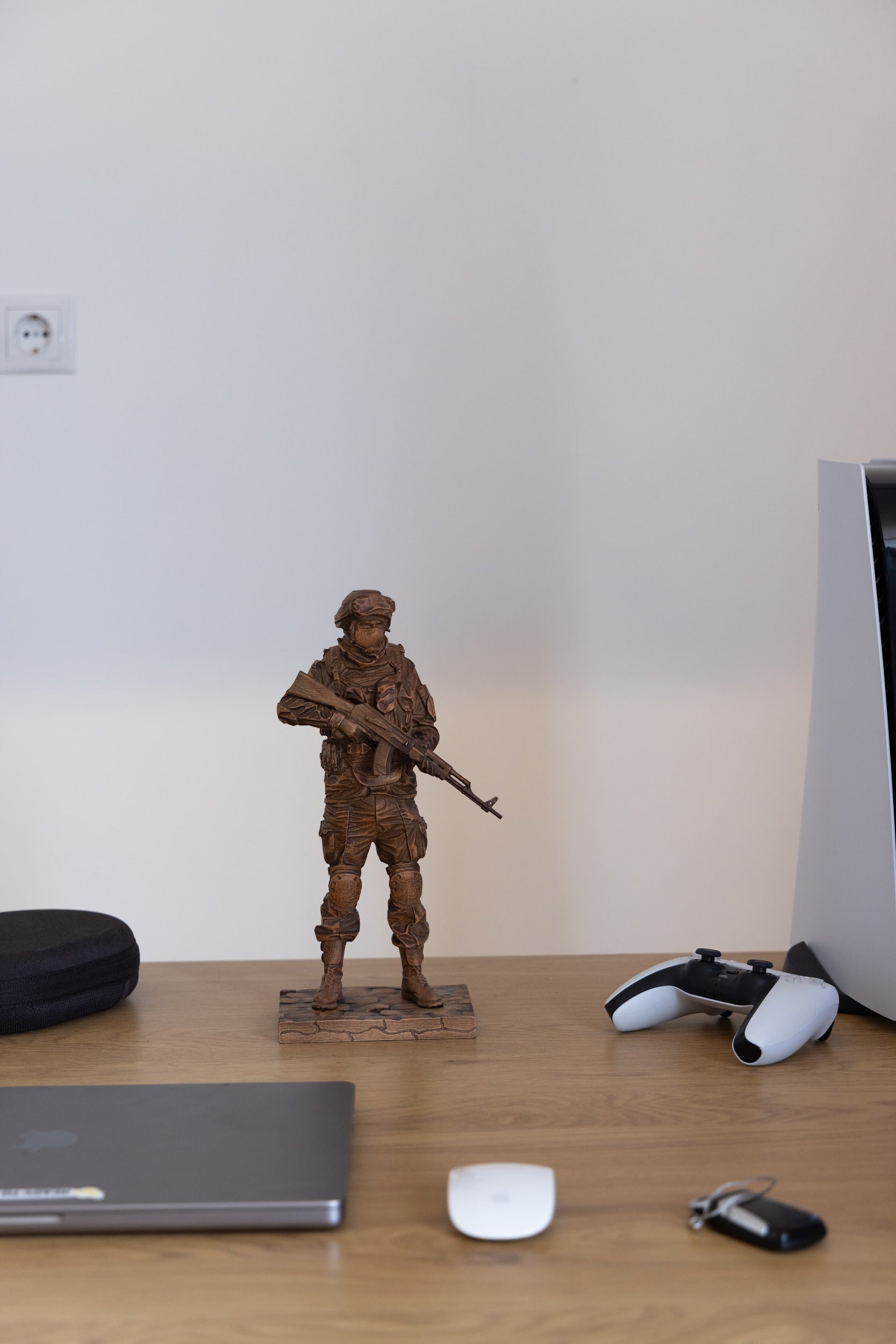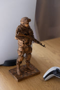 Your collection of wooden soldiers won’t be completed without this immersive item. Meet our wood-carved soldier’s sculpture that depicts a trooper in full armor. This wooden figurine was inspired by a brave and strong ZSU (Ukrainian Armed Forces) soldier, a true hero of our epoch. We captured the movement and paid high attention to the details of the statue’s armor and equipment. The statue shows a brave soldier in a bulletproof vest, a helmet, and a scarf protecting his face. He keeps a machine gun and his pose shows that the soldier is ready to fight, and he will put his life to protect his land.