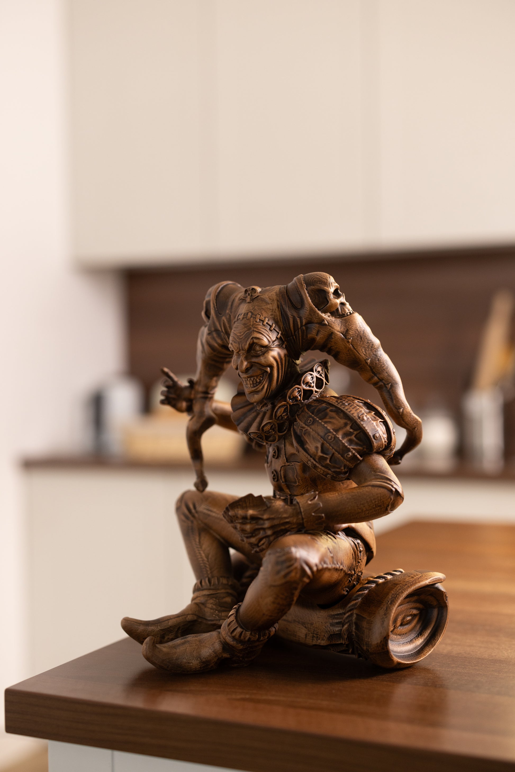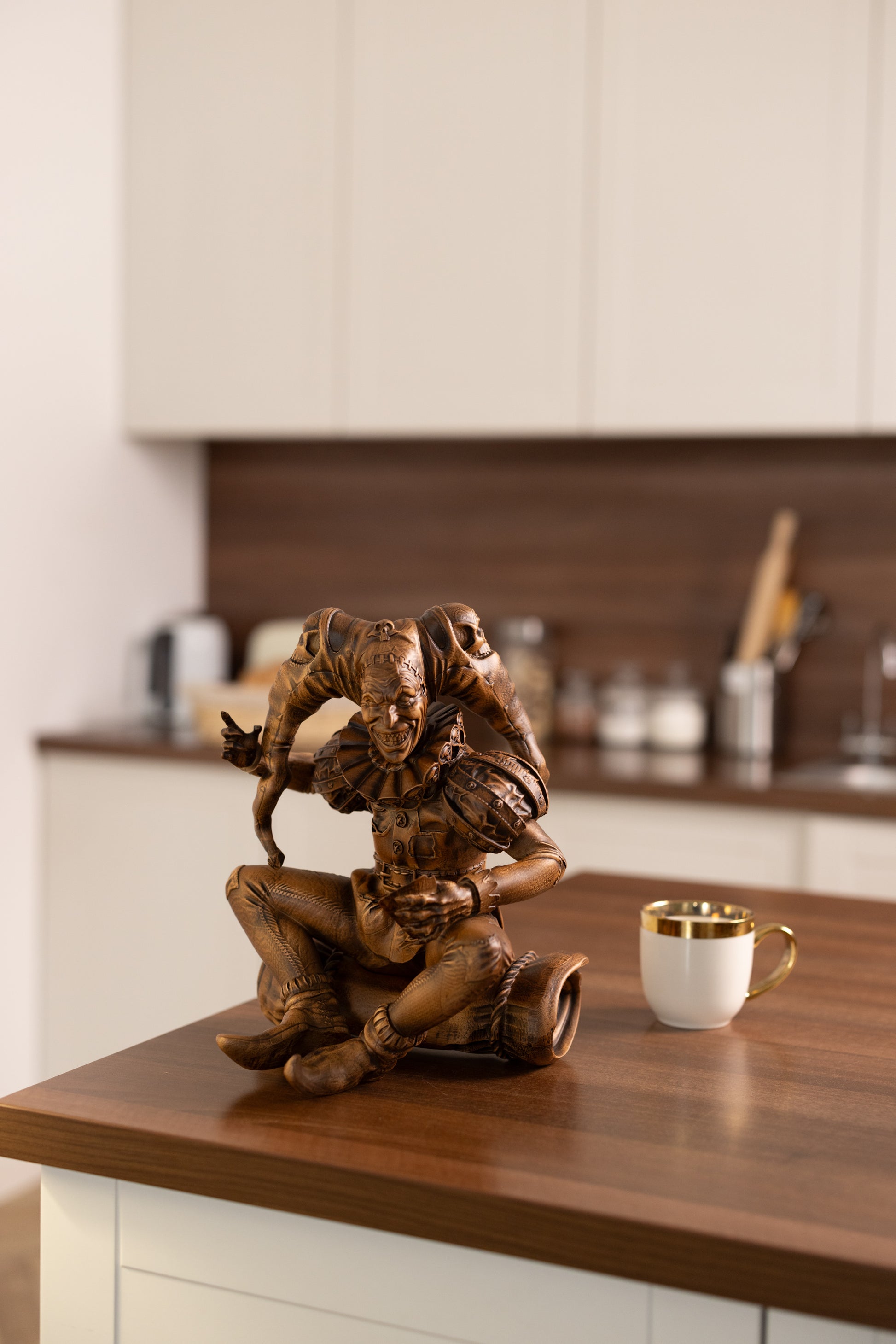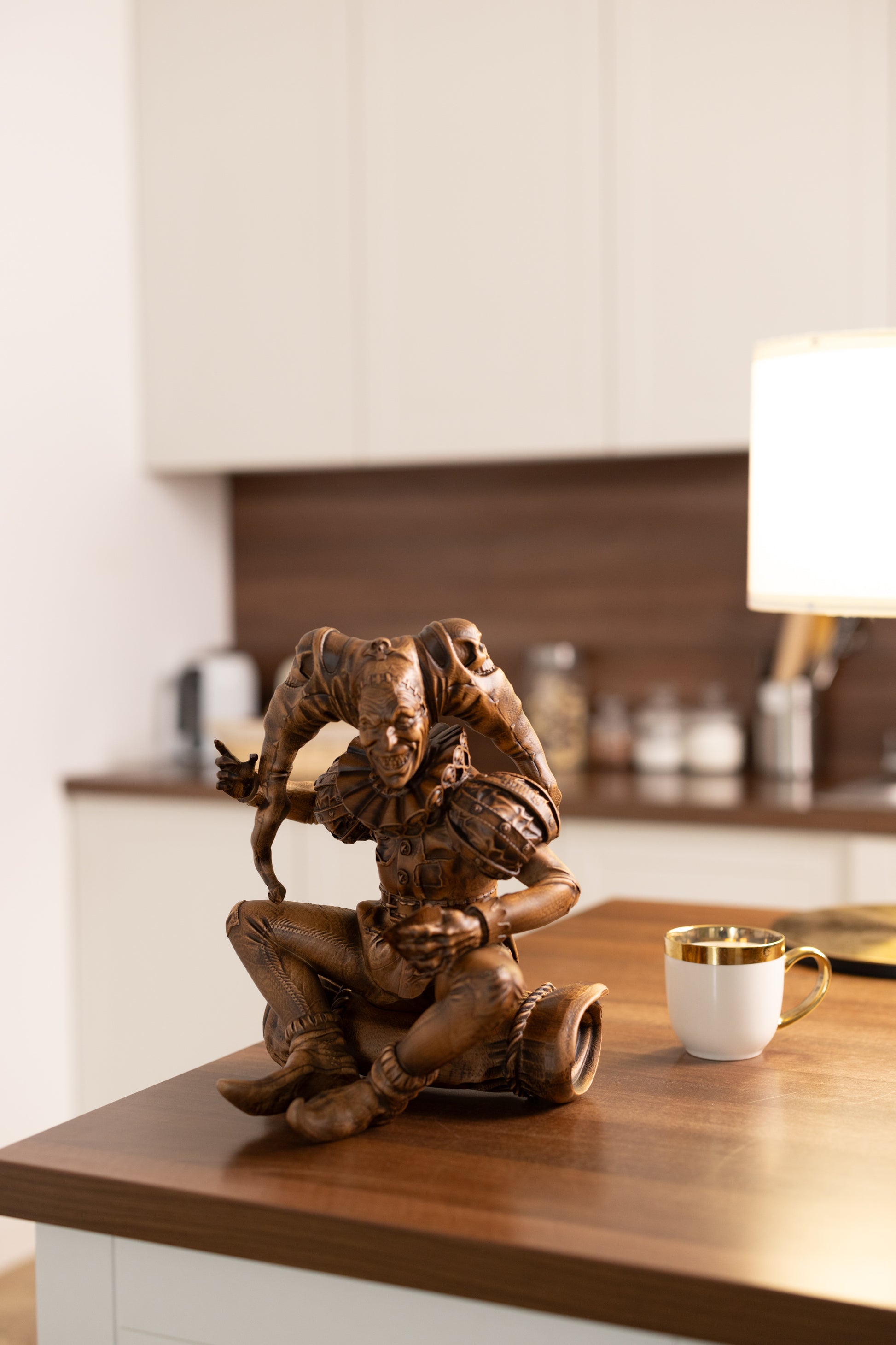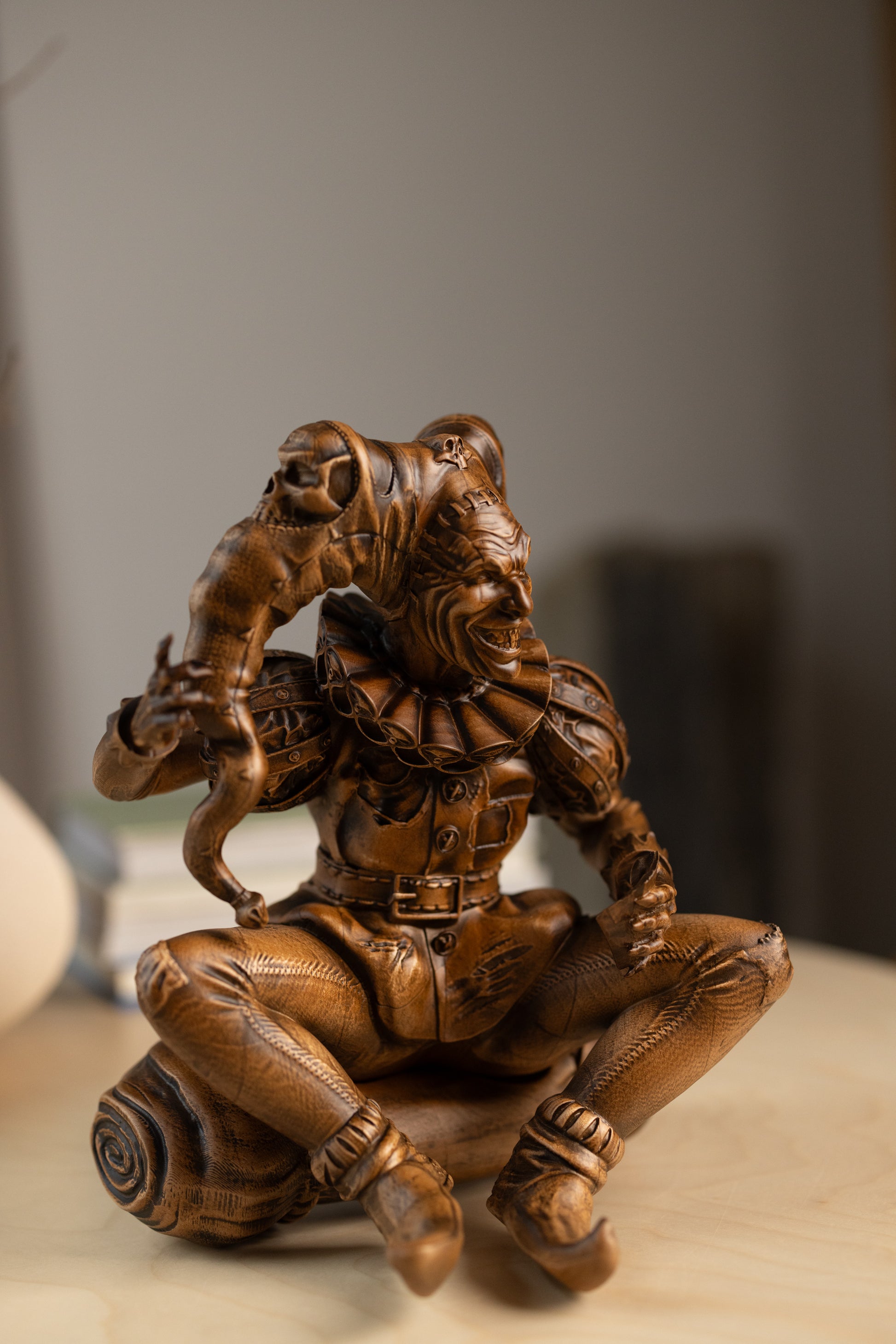 Wooden Joker Statue With Cards and Sculls On the Hat – an Exclusive Tabletop Design by WoodNev