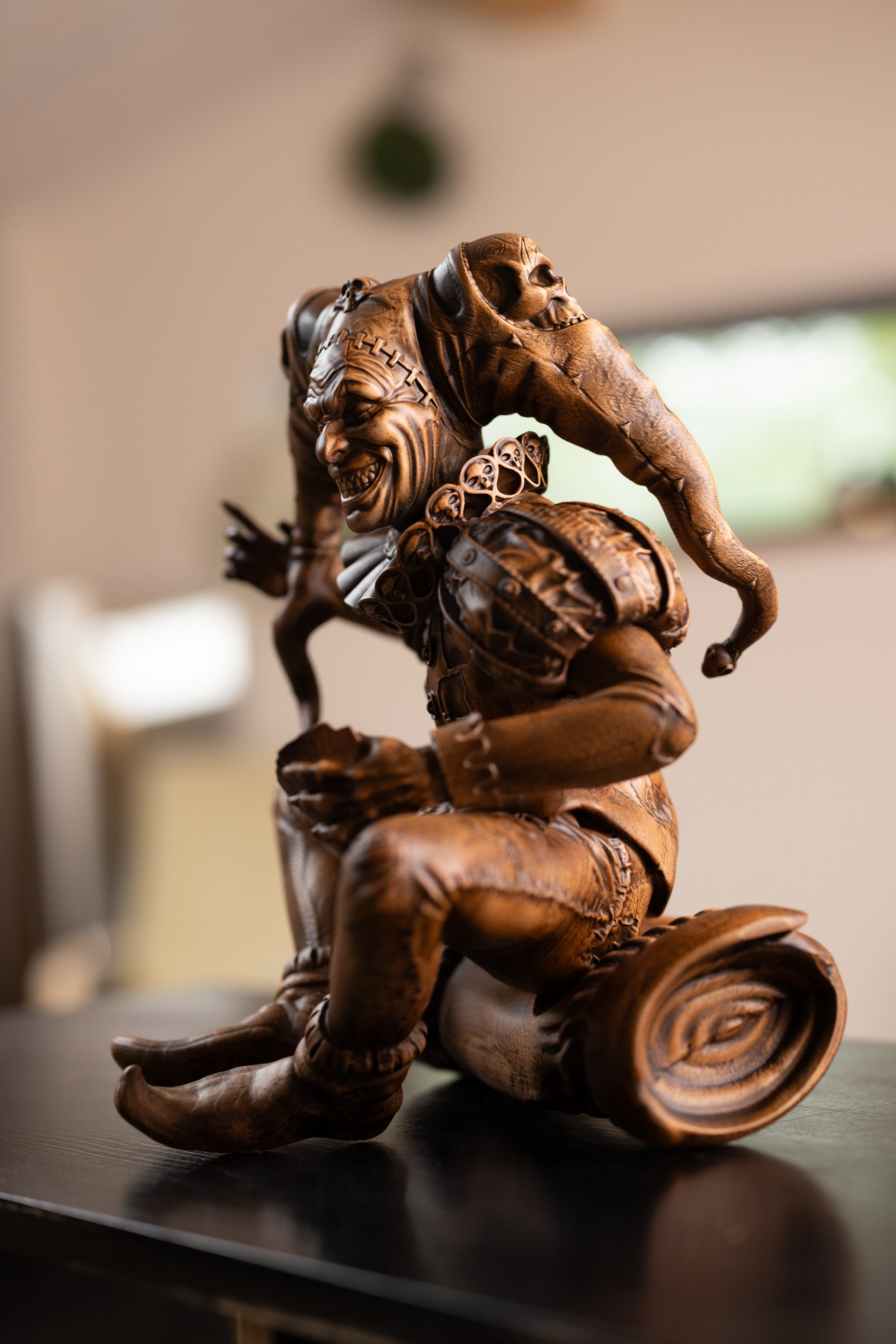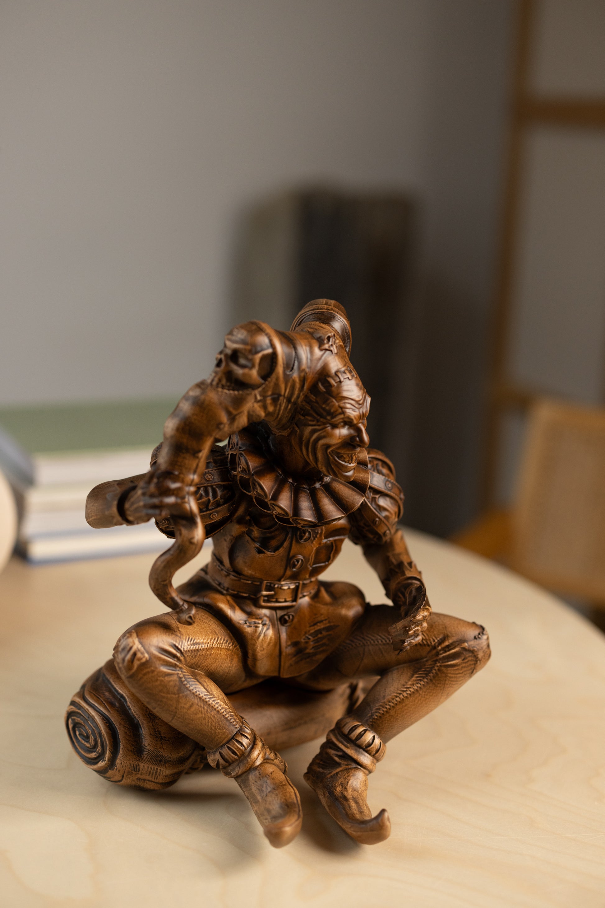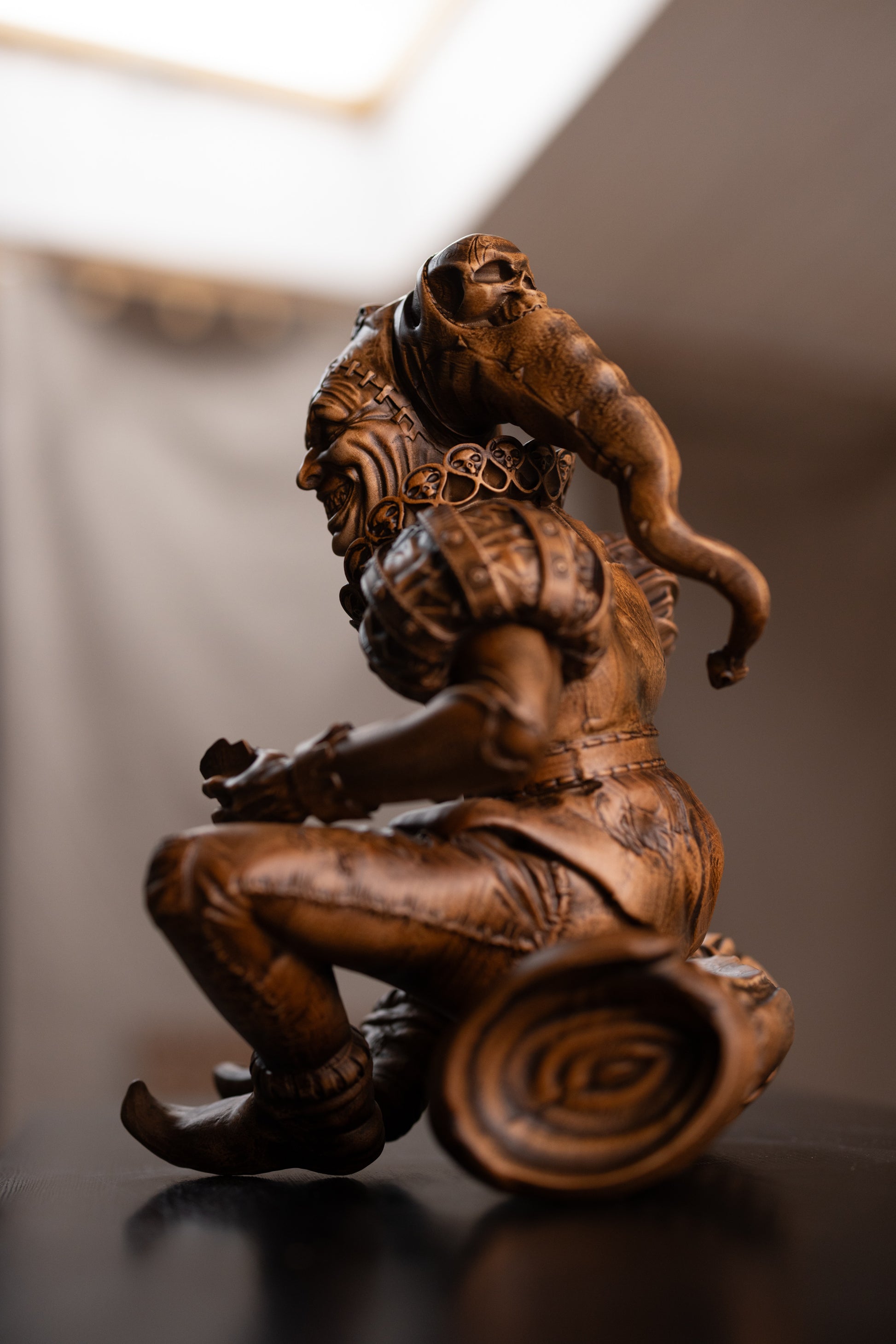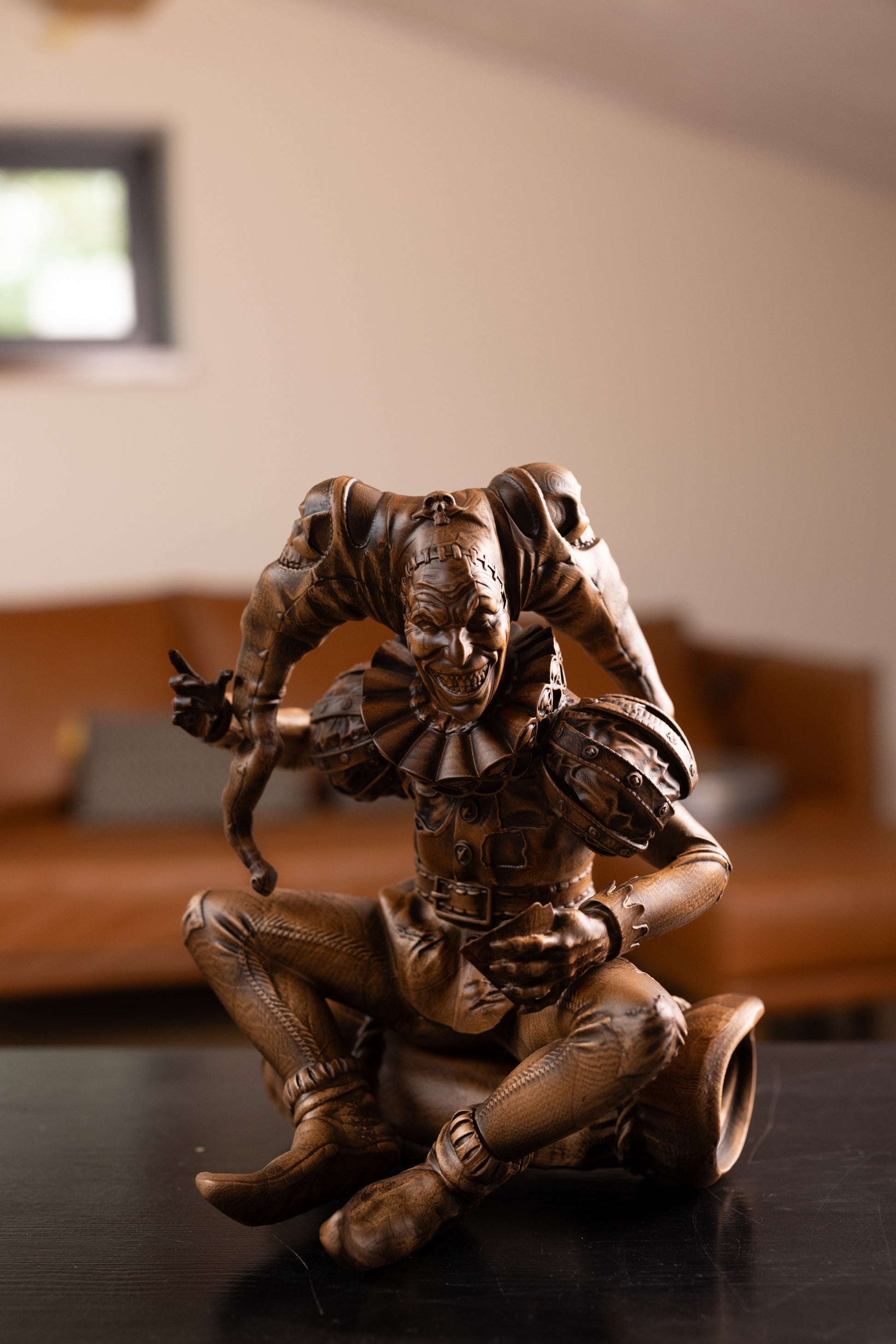 Wooden Joker Statue With Cards and Sculls On the Hat – an Exclusive Tabletop Design by WoodNev