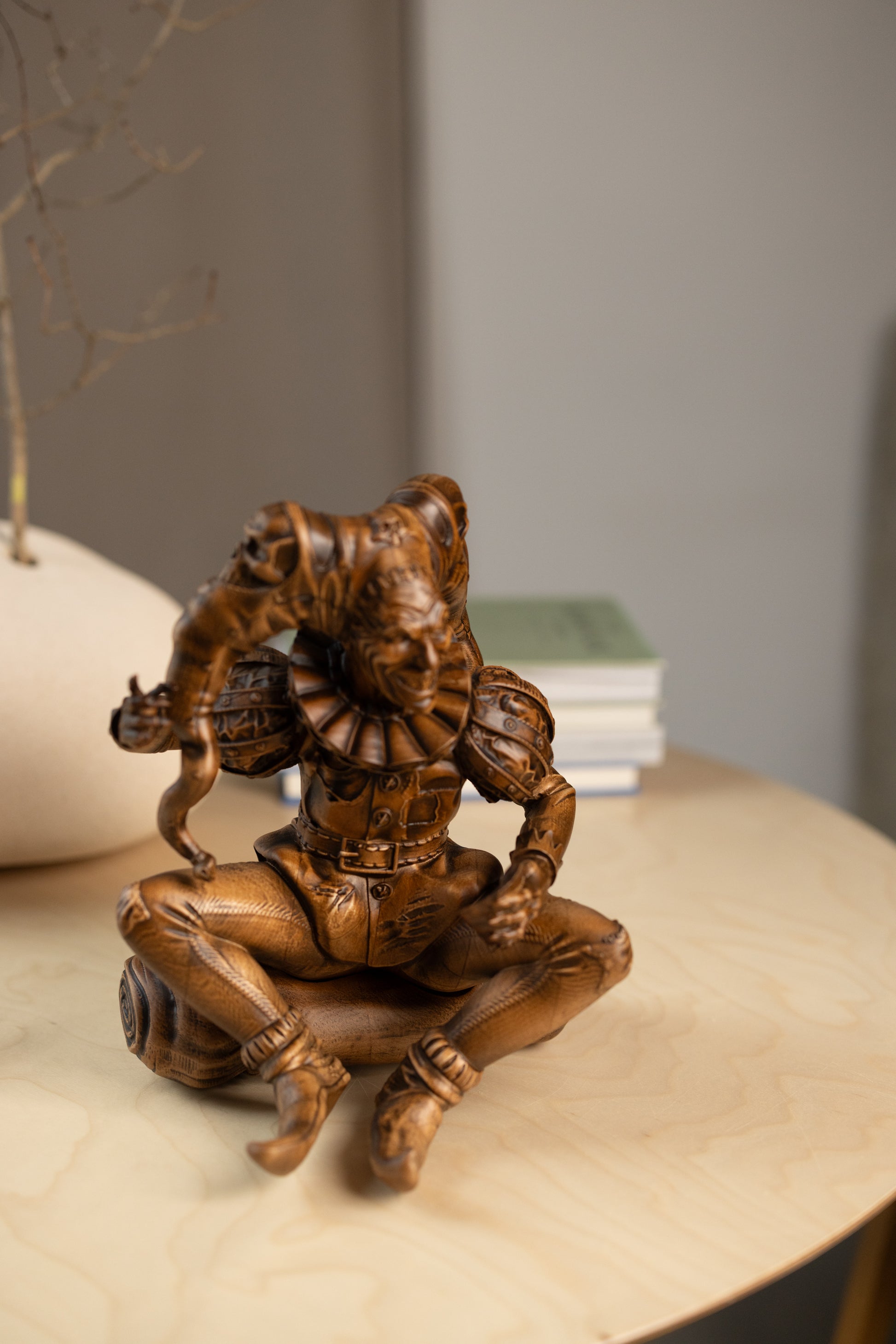 Enjoy the trickery in its essence! A wooden sculpture of a medieval jester resembling a cult card symbol and the tradition of Royal jokers at once is already available in stock!